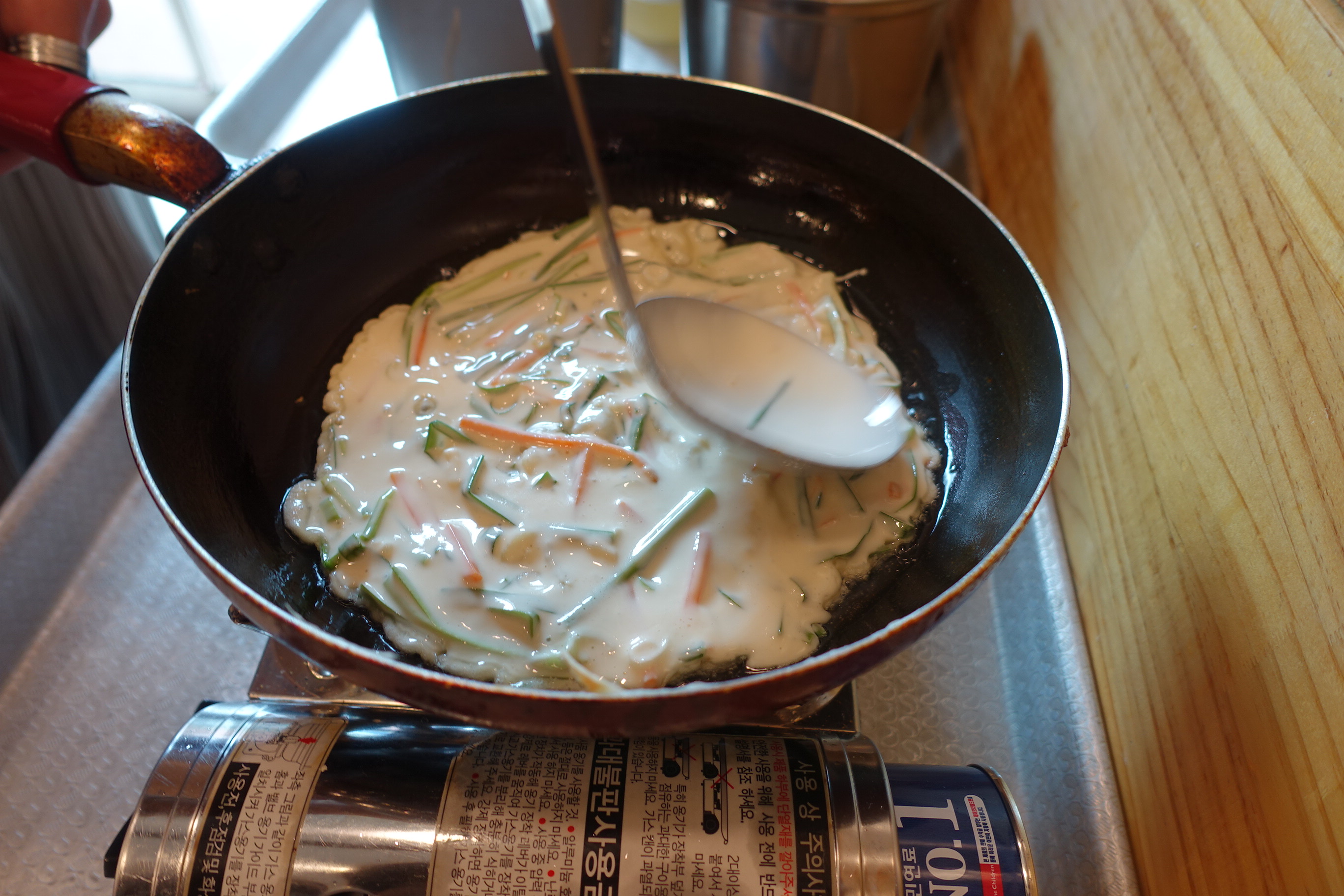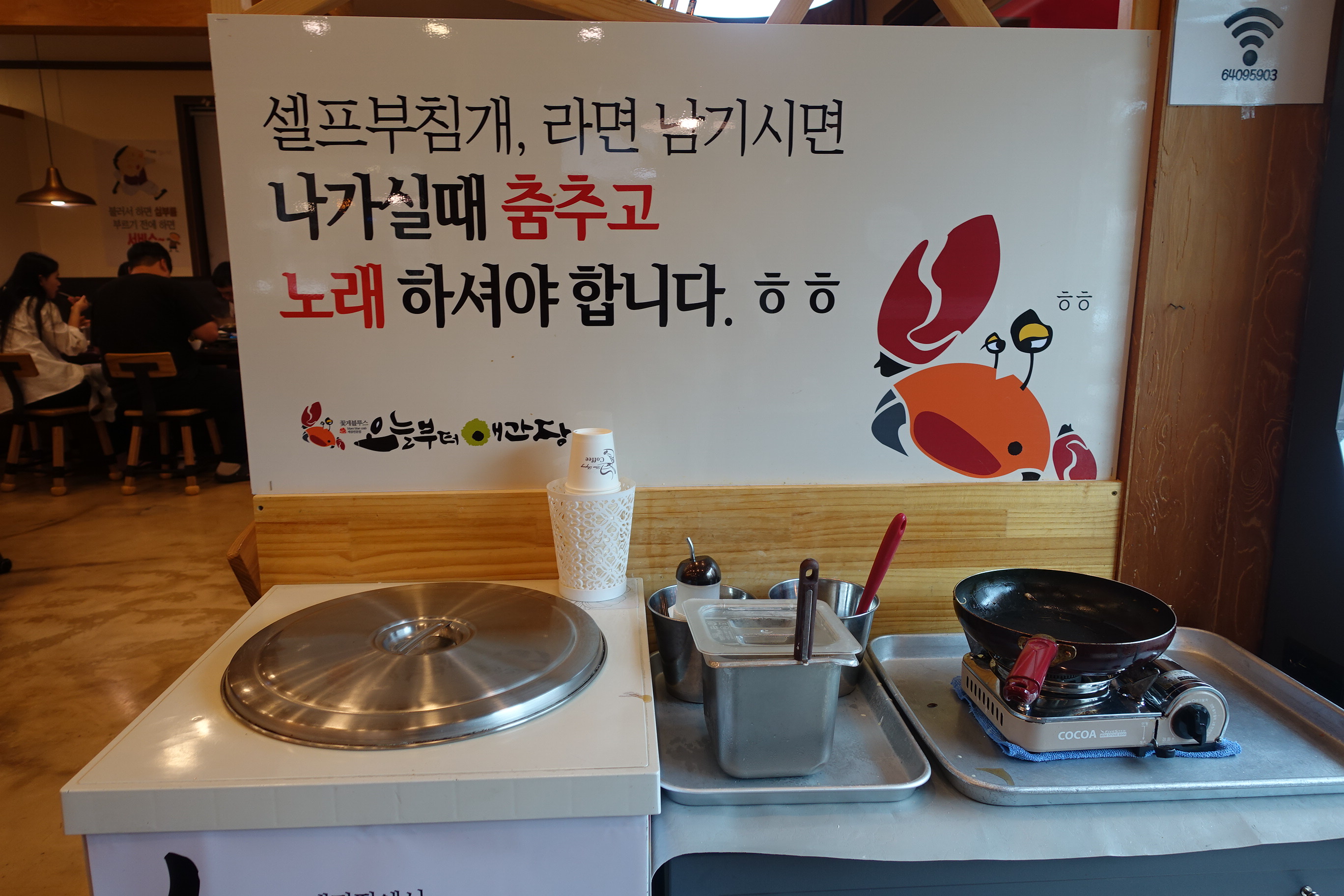 라면은 끓여주는 기계를 이용하면 되고, 부침개는 재료를 덜어 셀프로 굽굽하면 되는데 굽는 재미가 쏠쏠했어요.