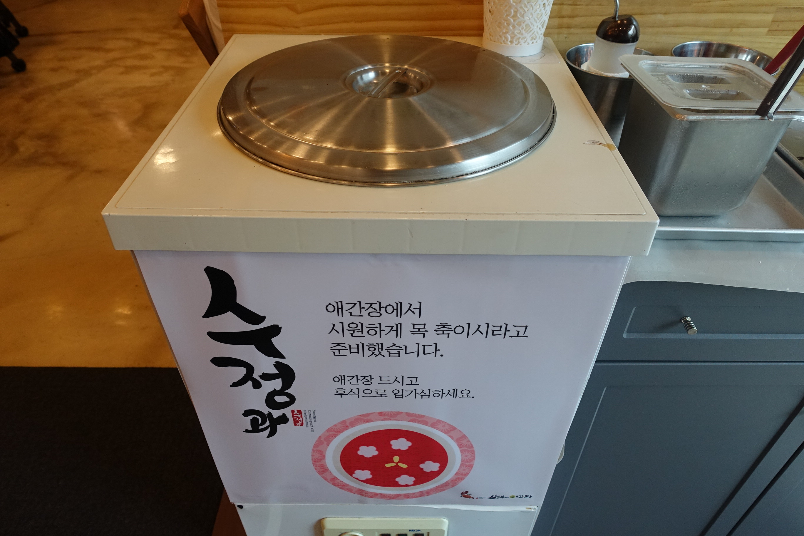 테이블당 한 번씩 이용할 수 있는 라면, 부침개 그리고 입가심으로 마실 수 있는 수정과!